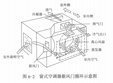 新風系統主要由新風門和混濁空氣排出門組成。新風門設置在空調器吸風側,可通過控制面板上的旋鈕或滑桿來控制其開、關。當空調器運行時,打開新風門,室外新鮮空氣從新風門吸入與室內經熱交換后的循環空氣混合,后送至室內。排風門設置在空調器排風側,于排除室內混濁空氣。圖6-2所示,是窗式空調器的新風循環示意圖。