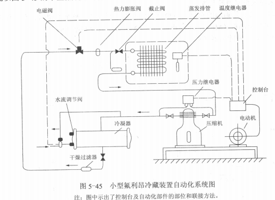 中小型冷庫的控制電路,一般包括壓縮機電動機的起動控制及各種《如欠壓、短路、過載等)保護環節 ,供液量和冷卻水的自動調節 ,冷藏室的溫度自動控制及工作壓力的自動保護。現以圖5-45的小型氟利昂冷藏裝置自動化系統組成的情況,作一簡單介紹。