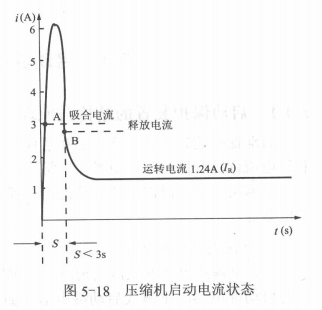 在壓縮機電動機接通電源的瞬間,由于只有運行繞組接入,電動機無法起動,此時有較大的啟動電流。該電流值超過了“A”點繼電器的吸合電流,街鐵被吸上,銜鐵帶動動觸點向上運動與靜觸點閉合,接通啟動繞組電源,在定子中產生旋轉磁場,使轉子轉動。而運行繞組中的電流隨著電動機轉速的升高而下降,當電動機轉速達到額定轉速的80%(約1s)時,運行繞組中的電流下降到“B”點繼電器的釋放電流值以下,繼電器線圖產生的電磁吸力無法吸住銜鐵,在自身重力的作用下,銜鐵下落使觸點斷開,從電路中斷開啟動繞組。此時,啟動繼電器線圈中雖然通過額定電流,但不足以吸動銜鐵。