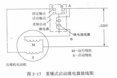 重錘式啟動繼電器工作原理”啟動繼電器的線圈和壓縮機電動機的運行繞組串聯在起,如圖5-17所示。