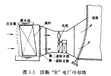 圖1-4是一種自然通風和機械通風共同作用的冷卻塔。在自然通風逆流式冷卻塔底部,加裝鼓風機以輔助塔簡通風。瑞舍吉·考垂(Research -Cottrell)公司設(shè)計的這種塔,高度為同容量自然通風逆流塔的1/2,底部直徑為其2/3,負荷小時可以不開風機。