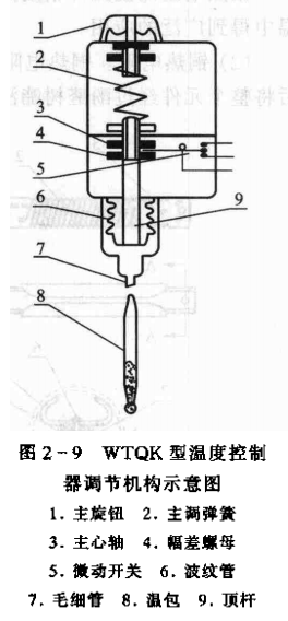 (2)WTQK型壓力控制器。常用的WTQK-11和WTQK-21型溫度控制器也是壓力式的。WTQK型溫度控制器的感溫系統(tǒng)也是由溫包、毛細管及波紋管組成。原理與WTZK-50型溫度控制器感溫系統(tǒng)的原理相同。但溫包的形式有棒式和螺旋式兩種,螺旋式溫包比較適用于空間溫度測量,棒式溫包用于容器或管道溫度測量。