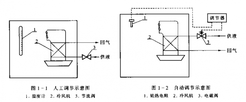 自動調節系統是在人工調節的基礎上產生和發展起來的。為了說明自動調節原理,先舉一個手動調節的例子。圖1-1所示為冷藏間庫溫人工調節示意圖,其調節過程是:
