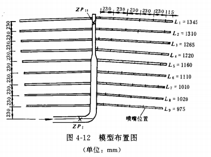 長度比尺1:5,分水管、配水管均用鐵管,噴嘴用鋼管。以噴嘴出口高程為零點。ZP11點測壓管水位,作為管式配水系統(tǒng)工作水頭的控制點,試驗時控制ZP11點,測壓管內水位分別為30、40、 50、 60、 65cm(原型值)。水位60cm時,測得管內各點水流速度、靜壓水頭和噴嘴流量,見圖4-14。由圖可見,沿分水管水流靜壓成增加趨勢,所以在第5,第6條配水管之間,將分水管管徑由聲500mm縮為#350mm(原體),使水流靜玉纂本不變,在配水管內,靜壓沿水流方向也呈增加趨勢,但變化很小。由干靜壓變化小,所以噴嘴流量相互差別也不大。但2條配水管之間,噴嘴流量差別較明顯,尤其在分水管收縮段的前后,管徑收縮,分水管靜壓變小,所以配水管中靜壓頭也相應變小,噴嘴泄量也變小。
