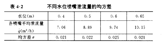 總起來看,在水位0. 4、 0. 5、 0. 6、0. 65m時,各噴嘴的泄水量分布還比較均勻。不同水位時所有噴嘴泄水量的均方差見表4-2。