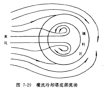 自然通風橫流式冷卻塔受風作用的模型試驗中,測得塔筒底部的流場,見圖7-29。將散熱器垂直安裝在塔筒外周的空冷塔也有類似的流場。由圖7-29可見,風不是直接穿過塔下部,而在塔內形成兩個對稱漩渦,進風量不利的區域不是背風面,而是在兩側。