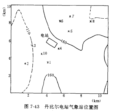 古金電站共設8個氣象站;布基電站共3;丹比爾電站共10.氣象站中,1個距電站要足夠遠,作為參考站,代表不受塔排出霧羽流影響情況,其他氣象站所受影響的大小,以此站為基準丹比爾電站的氣象站布置見圖7-43,其中第9站在電站南面17km處。