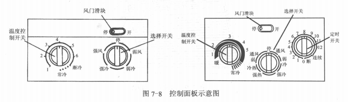 (2)制冷時應注意切鼠頻繁變動控制開關改變空調器的工作方式。停機后需重新開機時,必須間隔3min以上。目前市場上銷售的窗式空調器的控制面板上一般都裝有兩個旋鈕或三個旋鈕。有的還有風門滑塊等,如圖7-8所示。