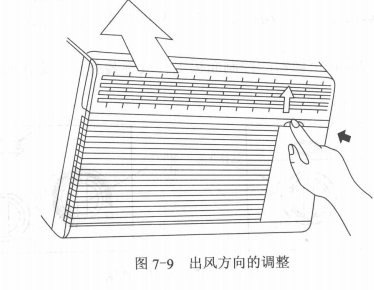 (3)出風方向的選擇 調節空調器面板上的出風格柵,橫片可調節上、下出風,豎片可調節左、右出風,但橫片應盡量避免向下,這會使溫控器誤動作,造成壓縮機頻繁啟動、停止。空調器出風方向的調整,如圖7-9所示。