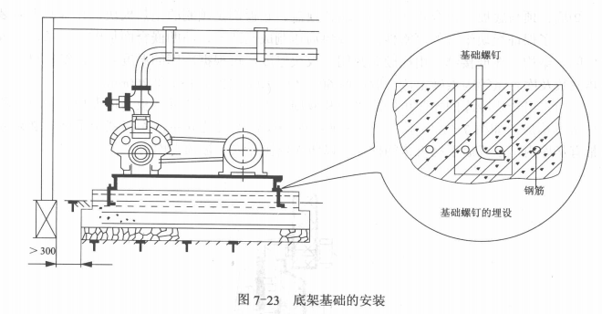 ①制冷設備(壓縮機組)基礎要有足夠的強度,混凝土基礎應埋灌在地平面以下。通常基礎重量約為壓縮機組重量的2~5倍。中小型機組,制冷壓縮機與電動機可先裝在一個共同的底架上,再安裝在基礎上,如圖7-23所示。