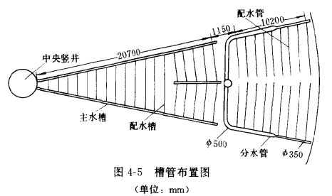在使用多個豎井時,逆流式自然通風冷卻塔各豎井中的水位很難保證一樣高。由于各豎井水位不同,造成塔內(nèi)配水不均勻,所以現(xiàn)在趨向采用一個豎井。在淋水面積大的冷卻塔中,采用一個中央豎井,主水槽就很長、如一個10000m2淋水面積的冷卻塔,采用十字形主水槽。則每個水格長達50m,同一流最時,沿槽的水面高程(有壓時表現(xiàn)為壓頭)將有較大的變化;小水量時槽遠端可能無水,所以現(xiàn)在常采用把50m分成兩段來供水,即分成塔內(nèi)區(qū)和外區(qū)配水,圖4-5所示為內(nèi)、外區(qū)配水的一個例子,但外區(qū)不由中央豎井供水。我們現(xiàn)在要介紹的方案,內(nèi)外區(qū)都由中央豎井供水,內(nèi)區(qū)的主水槽只通到內(nèi)外區(qū)交界處;外區(qū)主水槽從內(nèi)區(qū)主水槽下邊由豎井接出,到內(nèi)外區(qū)交界處抬高到內(nèi)區(qū)主水槽的高程,使二者槽頂同高,并在內(nèi)區(qū)主水槽的沿線上直通到塔壁附近。下槽只起送水作用,所以不連配水管。