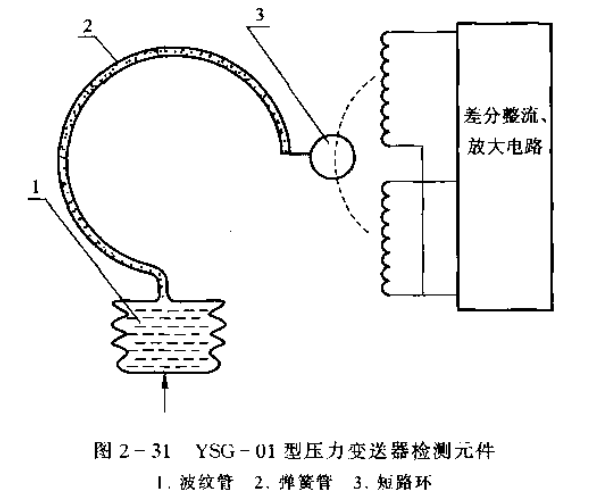 YSG-01型壓力變送器的檢測元件采用波紋管加彈簧管的形式,如圖2-31所示。由彈簧管和波紋管組成的封閉空間內充滿液體工質,被測壓力由導壓管引入氣箱,作用在波紋管上。由于液體不可壓縮,波紋管將感受到的壓力通過其充注的波體傳遞至彈簧管。當被側壓力變化時,彈簧管產生彈性形變,其自由端所帶的短路環也隨之產生相應的位移。