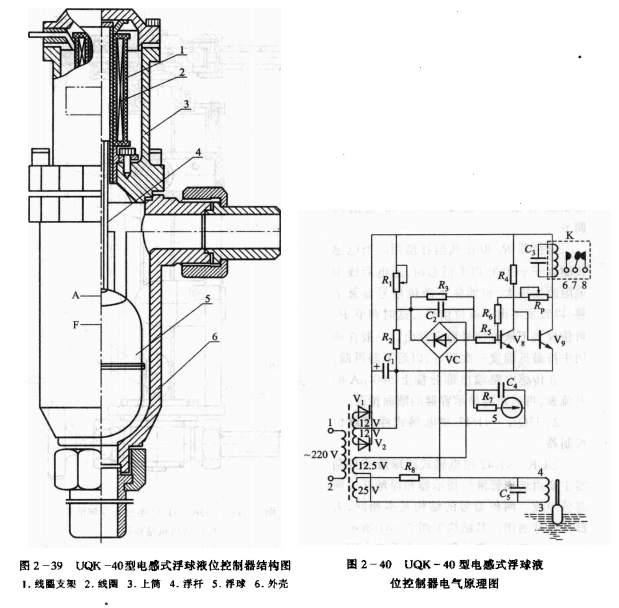 UQK-40型電感式浮球液位控制器適用于以氨、R12、R22為工質的制冷系統,與電磁閥配合使用,可自動控制容器內工質的液位,其結構圖如圖2-39所示,電氣線路圖如圖2-40所示。