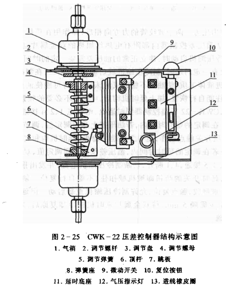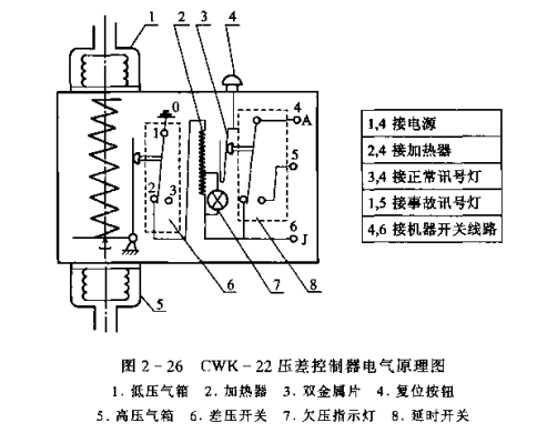 (1)CWK-22型壓差控制器。CWK-22型壓差控制器主要用于制冷壓縮機的油壓差保護,故又稱油壓差控制器。其結構示意圖如圖2-25所示,電氣原理如圖2一26所示。控制器由兩個波紋管對置設置。從曲軸箱來的低壓壓力接至上端氣箱,下端氣箱接至油泵的出口端,感受油泵排出壓力。兩個波紋管的力方向相反,都作用在頂桿6上,通過調節彈簧平衡。另外,CWK一22型壓差控制器內部附有電熱絲加熱的雙金屬片延時機構。設置延時機構的原因是:第一,制冷壓縮機啟動時,建立正常的油壓差需要一定的時間,油泵的油壓控制必須把這一段時間除去,沒有一定的延時,制冷壓縮機就啟動不了,第二,在制冷壓縮機運轉中,由于曲軸箱壓力不穩或帶進液體工質,使油壓不穩或成泡沫狀,均有可能使油壓降到危險壓力以下,但經若干秒后油壓往往能自行恢復,加上延時機構后,可避免不必要的頻繁停車。