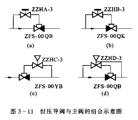 2. ZZHB-3型恒壓冰與氣用常開(kāi)型主閥組成氣用常開(kāi)型恒壓主閥。組裝方式如3-11所示。當(dāng)主閥出口壓力升高時(shí),ZZHB-3型恒壓閥成比例開(kāi)大,主閥隨之成比例關(guān)小;當(dāng)主閥出口壓力降低時(shí),ZZHB-3型恒壓閥成比例關(guān)小,主閥則成比例開(kāi)大。所以,這種組合方式可控制主閥的出口壓力便定在一定范圍內(nèi)。應(yīng)用于壓縮機(jī)的吸氣管控制時(shí),可防止機(jī)器吸氣過(guò)載。