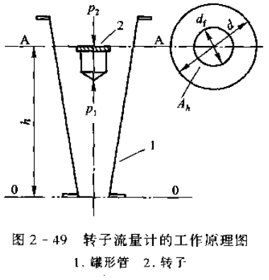 圖2-49所示為指示式轉(zhuǎn)子流量計(jì)的原理圖。它由一段向上擴(kuò)大的圓錐形管和密度大于測(cè)流體密度,且能隨被測(cè)流量大小而上下浮動(dòng)的轉(zhuǎn)子(又稱浮子)組成。