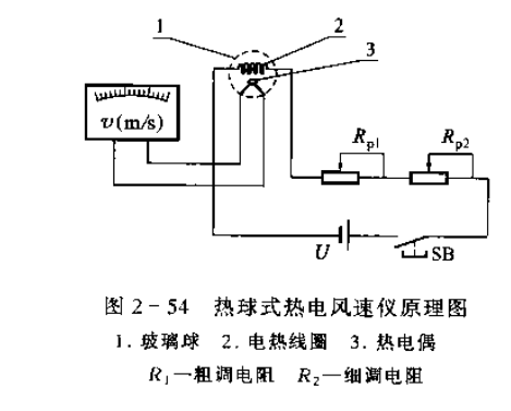 球式熱電風速儀由熱球式測頭和測量儀表兩部分組成。測頭是將鎳鉻線圈和測量熱球溫度的熱電偶一同置于玻璃球內當。通過鎳鉻線圈的加熱電流一定時,玻璃熱球測頭的溫度將隨風速的大小而變化,風速越大,球體散熱越快,其溫升越小,玻璃熱球測頭內的熱電偶產生的電壓也小;風速越小,球體散熱越慢,其溫升越大,測頭內熱電偶的電正也就越大。熱電偶電壓的大小,通過測量儀表轉換成相應的電流由表頭指示出米,在表盤上可直接讀出風速值。儀表原理如圖2-54所示。