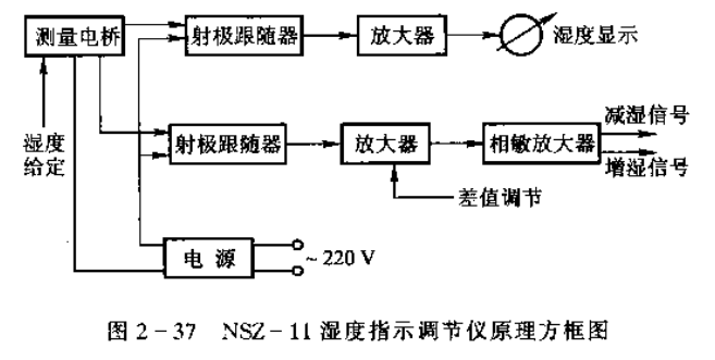 (2)NSZ-11型電阻式濕度指示調節儀。NSZ-11型電阻式濕度指示調節儀是利用氯化鋰濕敏元件測量空氣的相對濕度的。儀表可以遠距離濕度顯示并發出濕度雙位調節信號,與增濕機構和減濕機構相配合,對濕度進行雙位調節。該儀表原理方框圖如圖2-37所示。