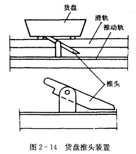 貨盤規格為700×400mm,每盤間50mm,每個盤底下焊有兩道扁鐵,承放在軌道上,每對軌道有兩個推動裝置,當液壓系統將推動裝置推動時,推頭頂住盤底的扁鐵,即將貨盤向前推進。當推動裝置后退復位時,推頭被后面的扁鐵壓下,滑過后,由于偏心作用,推頭便自動項起,卡住扁鐵。當推動裝置作第二次推動時,推頭又把貨盤向前推進。通過這樣反復動作,貨盤便向前移動。兩道扁鐵的距離要與推動距離相適應。另外還有兩個提升裝置,將貨盤分層提升。推頭裝置見圖2-14。
