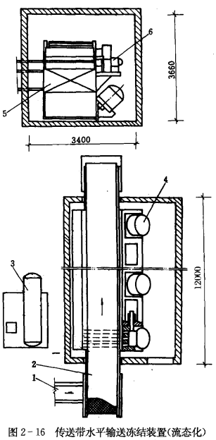這種凍結裝置也可以根據具體情況做成多層和多排輸送裝置。冷風機可放在旁側吹風,效果也較好。