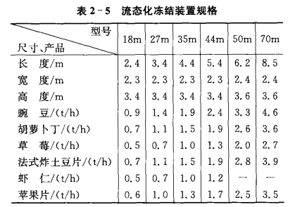 這種凍結裝置適用于直徑約40mm或長約125mm的食品,如可可豆、豆角、胡蘿卜丁、球芽甘藍、玉米段及切成塊、片、條狀的蔬菜,還有草莓、蘋果片菠蘿片、蝦仁、肉丁等。各種型號凍結裝置的生產能力見表2-5。流態化凍結裝置的結構參見圖2-16。