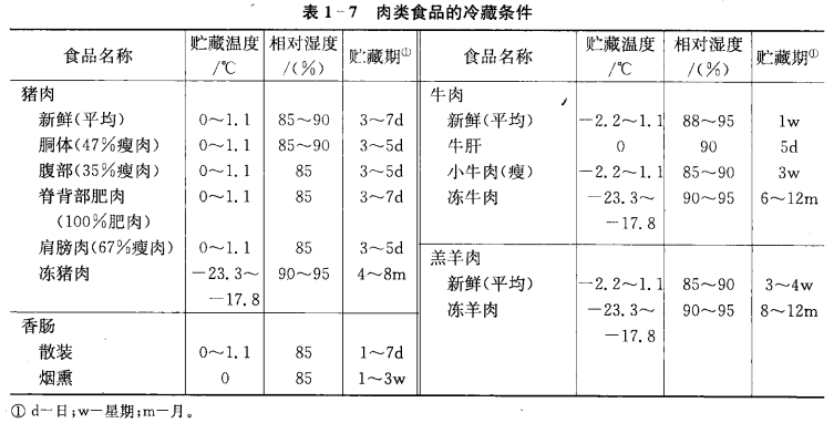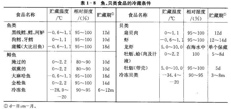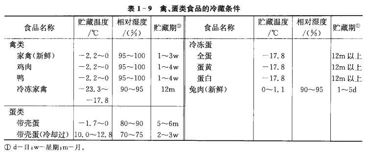 表1-7,1-8和1-9分別列出了肉類、負貝類和禽蛋類食品的冷藏條件。