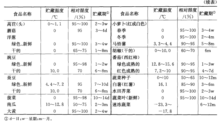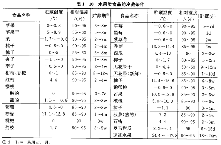 表1-10和1-11分別列出了水果和疏菜類食品的冷藏條件。
