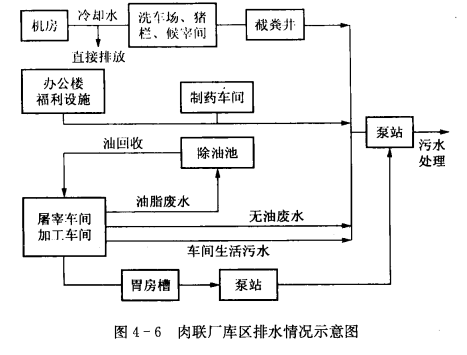 供水的冷風機融霜排水;制冰排水:來自制冰間。肉聯廠庫區污水排放情況示意圖見圖4-6。
