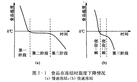 2、食品凍結的溫度曲線和冰結品最大生成帶。食品凍結時的溫度曲線是根據凍結速度而變化的,但不論是快速凍結或慢速凍結,在凍結過程中,溫度的下降可分三個階段;見圖2-1。