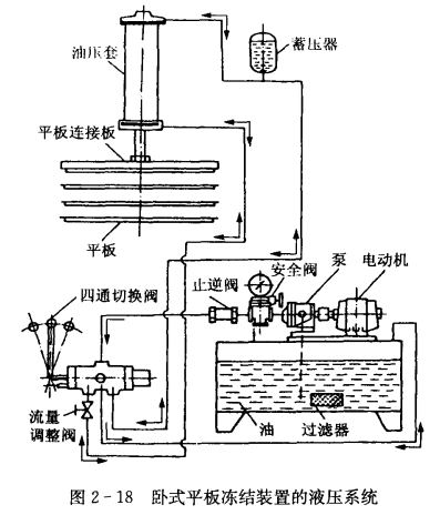 平板凍結裝置亦稱接觸式凍結裝置,常見有臥式和立式兩種型式。臥式平板凍結裝置的凍結平板系水平安裝,一般有6~16塊平板。平板之間的間距由液壓裝置調節。平板上升時兩板間的最大凈距約110~115mm,下壓時兩板間的間距視食品盤的高度而定。間距擴大時將被凍食品(裝盤或盒),啟動液壓油缸(液壓20~45MPa),使被凍食品緊密接觸平板而進行凍結。為了防止食品變形和壓壞,可在平板之間放入與食品厚度相同的角鋼作為墊塊,液壓油缸一般位于平板凍結裝置外殼的上部,為雙作用形式,下壓時使食品壓緊于平板之間,當食品凍好時又將平板與食品拉開。臥式平板凍結裝置的液壓系統可見圖2-18。