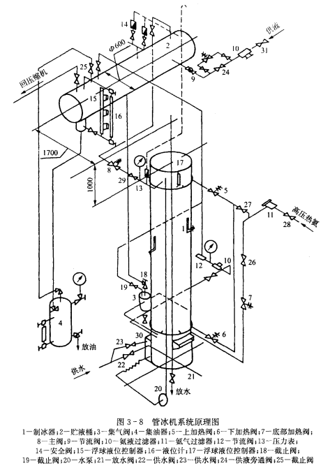 制冰機(jī)的蒸發(fā)器高度為3~4m,生產(chǎn)的管冰外徑50mm,壁厚10~15mm,長50~80mm,管冰的凍結(jié)時間約為15min,凍結(jié)成冰柱的時間約為40min,排液和脫冰時間約為10min。
