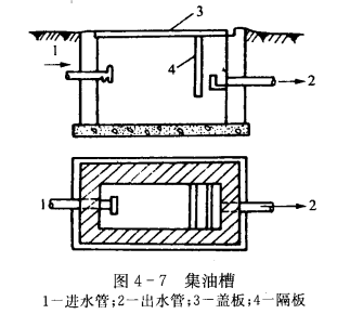 在屠宰車間的劈半、剖腹、拆腸等有沖洗水處應(yīng)設(shè)集油槽,隨時回收含油脂污水表面的油脂。集油槽的原理是降低污水流速和改變流向,并利用油脂比水輕的特點收集浮在水面上的油脂。集油槽可用薄鋼板焊制,其容積一般可按10~15min的沖洗水量來確定,構(gòu)造形式可參照圖4-7所示。