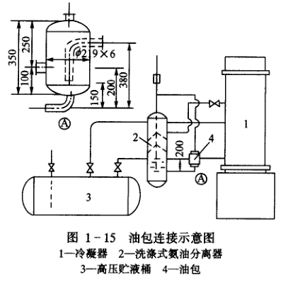 制冷系統采用洗滌式氨油分離器時,應注意洗滌式分離器的進液管是從冷凝器水平出液總管的底部接出的(也可用彎管連接),并有一定的高差(見圖1-14),這樣才能保證洗滌式氨油分離器的氨液供應。此外,還可以設置油包供液(見圖1-15)。