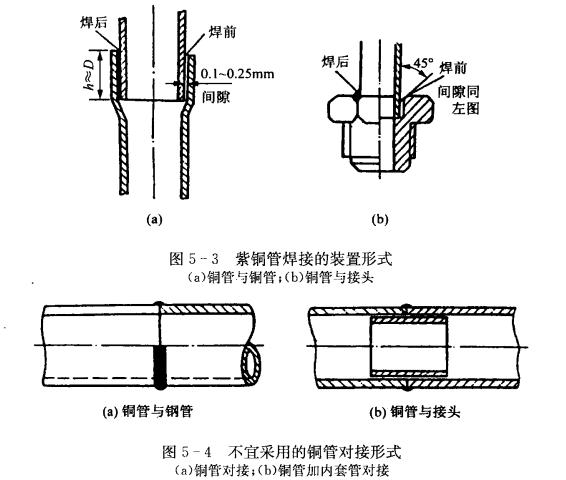 相同直徑紫銅管的對焊,應采用插入焊的結構形式,見圖5-3。紫銅管的一端用鋼沖模沖成擴口,將接頭部分內外表面用砂布擦亮,并插入擴口內壓緊,以免焊接時焊料從間隙流進管內,焊接時最好將管子垂直安放。同管徑對接時,不宜采用如圖5-4所示的焊接方式,因紫銅管壁薄,難保證焊接質量。