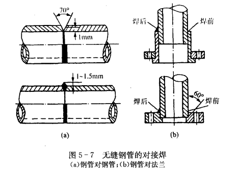 無縫鋼管一般采用電焊,不宜采用氣焊。因為氣焊的應力難以消除,可采用對接方式進行焊接,如圖5-7所示。管口應事先加工成適當的坡口才可以進行焊接。焊料為低碳焊條,材料的牌號:氣焊-08鋼氣焊條,電焊-422426。
