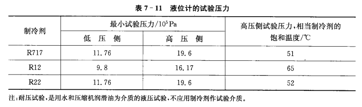 為了保證使用安全,液位計應經耐壓試驗,其試驗壓力見表7-11。液位計內應清潔,防止堵塞,玻璃管式溫度計應設有金屬保護套,定期檢查液位指示、控制和報警裝置,并保證靈敏可靠。