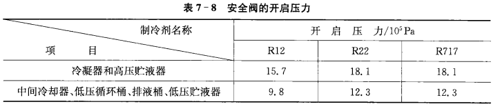 幾種常用制冷劑(R12、R22、R717)所用制冷設(shè)備的安全閥開(kāi)啟壓力見(jiàn)表7-8。
