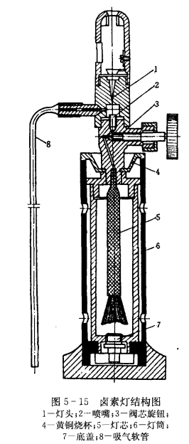 充氟利昂檢漏時,可在系統內充入少量的氟利昂氣體,使系統內壓力達0. 2~ 0. 3MPa。然后開始檢漏,氟利昂檢漏可使用鹵素燈,鹵素檢漏儀。鹵素燈又名校漏儀,它的結構見圖5-15所示。