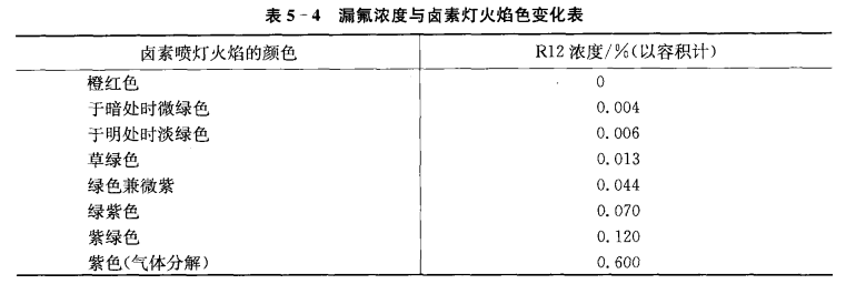 鹵素燈具體使用時,先將底盤卸下,加滿乙醇(即酒精,含量應在99.5%以上)或甲醇。再將底盤蓋上旋緊,把燈直放在平地上,向黃銅燒杯內注入乙醇,并把它點燃,以加熱燈體和噴嘴,以熱一從傳給燈筒,并加熱簡中的乙醇,使乙醇汽化,壓力升高。待盤內乙醇快要燒光時,就要微開閥桿,讓乙醇蒸汽從噴嘴噴出,蒸汽連續燃燒。噴嘴的上面有一個旁通孔接上吸氣軟管,由于噴嘴的高速噴射,使噴射區內的壓力低于大氣壓,空氣就經旁道管被吸入。若被檢查的空氣中含有氟利昂蒸汽與噴燈火焰相接觸,使化合成氟化銅氣體(Cu+CI2=CuCI2 ),這時火焰的顏色隨空氣中含氟利昂多少而變化。詳見表5-4。