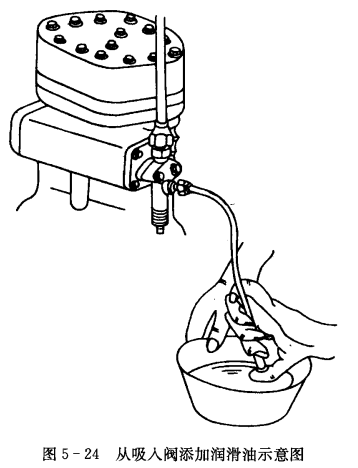 ①關閉吸入閥多用孔道,用接管的一端接多用孔道,另一端能到盛油容器中,見圖5-24。