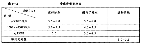 目前推廣使用常溫穿堂。常溫穿堂的寬度應能滿足冷庫運輸作業。常溫穿堂的寬度參見表 1-2。