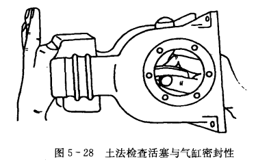 另一種是土方法,見圖5-28,將連桿活塞組重新塞進氣缸,并推至頂部,用一只手掌封住汽缸上端面(一般指小缸徑的壓縮機),另一只手抓住連桿大頭往外拉。拉下一段距離后,如果封住氣缸的手掌有被吸得很牢靠的感覺,而且將連桿繼續往下拉覺得較費勁,拉連桿手一放,活塞能自動彈回去,則說明氣缸與活塞之間的翻氣量不大,可以繼續使用。如果封氣缸的手掌感覺不到有吸力或吸力不大,將連桿慢慢往下拉也不費勁,甚至連桿活塞組會很快地自行落下,則表明氣缸間隙過大,漏氣嚴重,一般應更換活塞,必要時需幢磨氣缸或更換氣缸套(對于采用氣缸套的結構)。