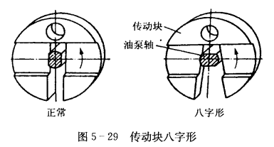 ⑤油泵傳動(dòng)塊八字形。油泵軸與壓縮機(jī)曲軸后軸頸端面的傳動(dòng)連接,有一傳動(dòng)塊,它有一開(kāi)口槽(圖5-29),油泵軸端的方榫插入槽內(nèi),以帶動(dòng)油泵轉(zhuǎn)動(dòng),當(dāng)排油壓力過(guò)高或經(jīng)常受到?jīng)_擊,開(kāi)口槽變形成八字式,使方榫打滑,油泵不會(huì)轉(zhuǎn)動(dòng),需拆開(kāi)換一新傳動(dòng)塊。