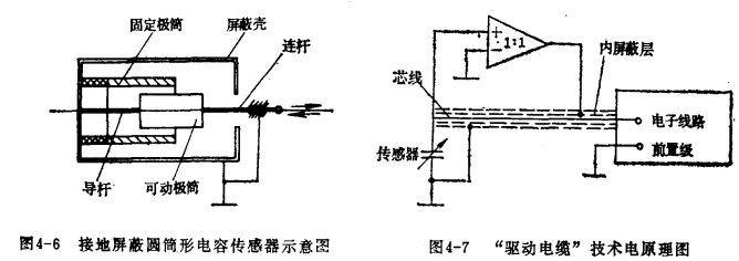 ②注意傳感器的接地和屏蔽。圖4-6為采用接地屏蔽的賀簡形電容式傳感器。圖中可動極簡與連桿固定在一起隨被測值位移,并與傳感器的屏蔽這(良導(dǎo)體)同為地,因此當(dāng)可動極筒移動時,它與屏蔽殼之間的電容值將保持不變,從而消除了由此產(chǎn)生的虛假信號。電纜引線也必須屏蔽至傳感器屏蔽殼內(nèi)。為了減小電纜電容的影響,應(yīng)盡量使用短而粗的電纜線,縮短傳感器至電子線路前置級的距離。