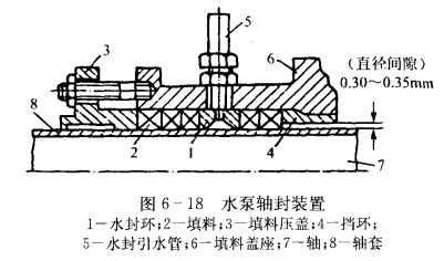 填料盒上的水封環(huán)和引水管5,也要拆下清洗,使它保持暢通.在裝配填料時(shí)應(yīng)注意各部分的間隙,擋水環(huán)4和軸套8(沒有軸套時(shí)指軸)之間的間隙應(yīng)為0.3~0.5mm,填料蓋與軸必須保持同心,其間的間隙應(yīng)為0.4~0. 5mm。間隙過小,容易和軸發(fā)生摩擦。以上間隙標(biāo)準(zhǔn)應(yīng)嚴(yán)格遵守,如不合格必須進(jìn)行調(diào)整。