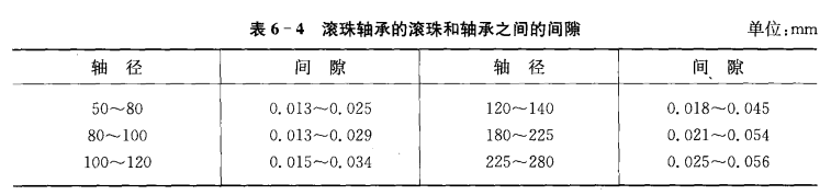 滾珠軸承的檢修:將滾珠軸承拆下后放入煤油中清洗干凈,檢查內(nèi)外環(huán)有無(wú)裂紋。內(nèi)環(huán)與環(huán)之間的間隙是否在規(guī)定標(biāo)準(zhǔn)(見表6-4)內(nèi),檢查滾珠有無(wú)損傷或破碎。如果超出規(guī)定尺寸,說(shuō)明鋼珠或內(nèi)、外圈已經(jīng)磨損,這時(shí)要更換同型號(hào)的新軸承。