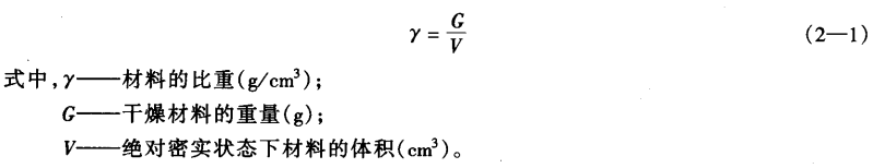 在工程中,把材料在絕對密實狀態下的單位體積的重量稱為比重。按下式計算: