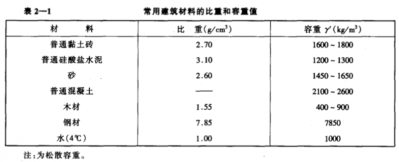 除鋼和水外,一般材料的容重均小于比重。因容重更能反映材料的真實屬料學中,常選用容重 這個指標。常見的建筑材料的比重和容重值見表2-1