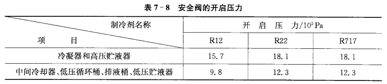 幾種常用制冷劑(R12,R22,R717)所用制冷設(shè)備的安全閥開啟壓力見表7-8。