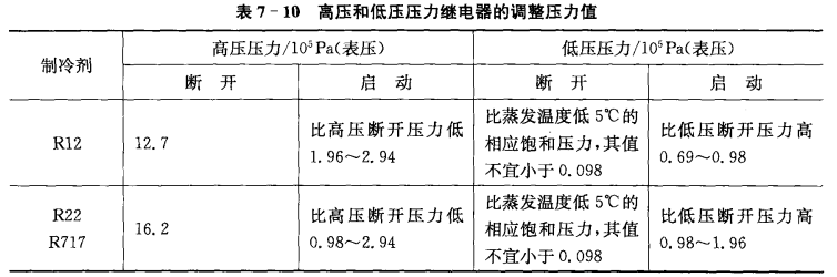 高壓和低壓繼電器的調整壓力值,依制冷劑的種類而定。表7-10列出常用的R12,R22和R717制冷劑,其壓力繼電器觸點斷開和啟動的調整壓力值。